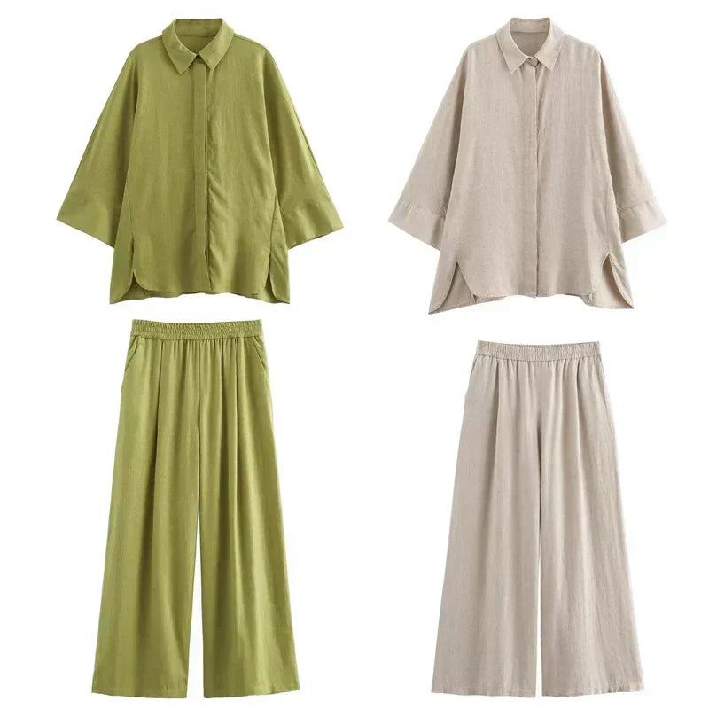 Das klassische 2-teilige Set Winona besticht durch seinen lockeren Schnitt, den klassischen Kragen und die hohe Taille. Die Hose mit weitem Bein und atmungsaktivem Stoff bietet perfekten Komfort und Eleganz. Ideal für stilvolle Auftritte und entspannte Tage.